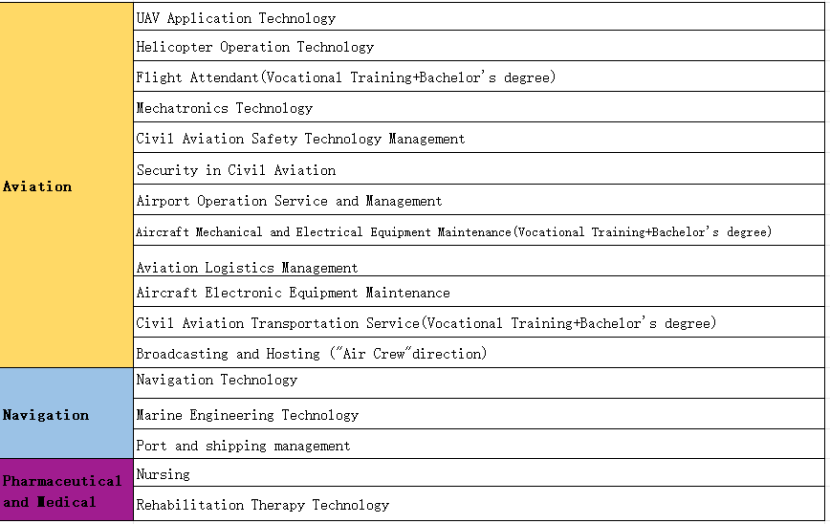 There are 8 academics under the college:the School of Flight Services, the School of Civil Aviation Transportation, the School of Mechanical and Electrical Engineering, the School of Maritime Engineering, the School of International Tourism, and the School of Humanities and Social Sciences,School of Marxism,Department of 3 years(secondary technical) and 2 years (higher vocational) Education. There are currently 45 majors(See the table below for details) and 2 national model majors (civil aviation transportation, air crew ), 2 modern apprenticeship pilot majors granted by the Ministry of Education (aircraft mechanical and electrical equipment maintenance, hotel management), 1 national backbone major (aircraft mechanical and electrical equipment maintenance), and 5 provincial distinctive backbone majors.
